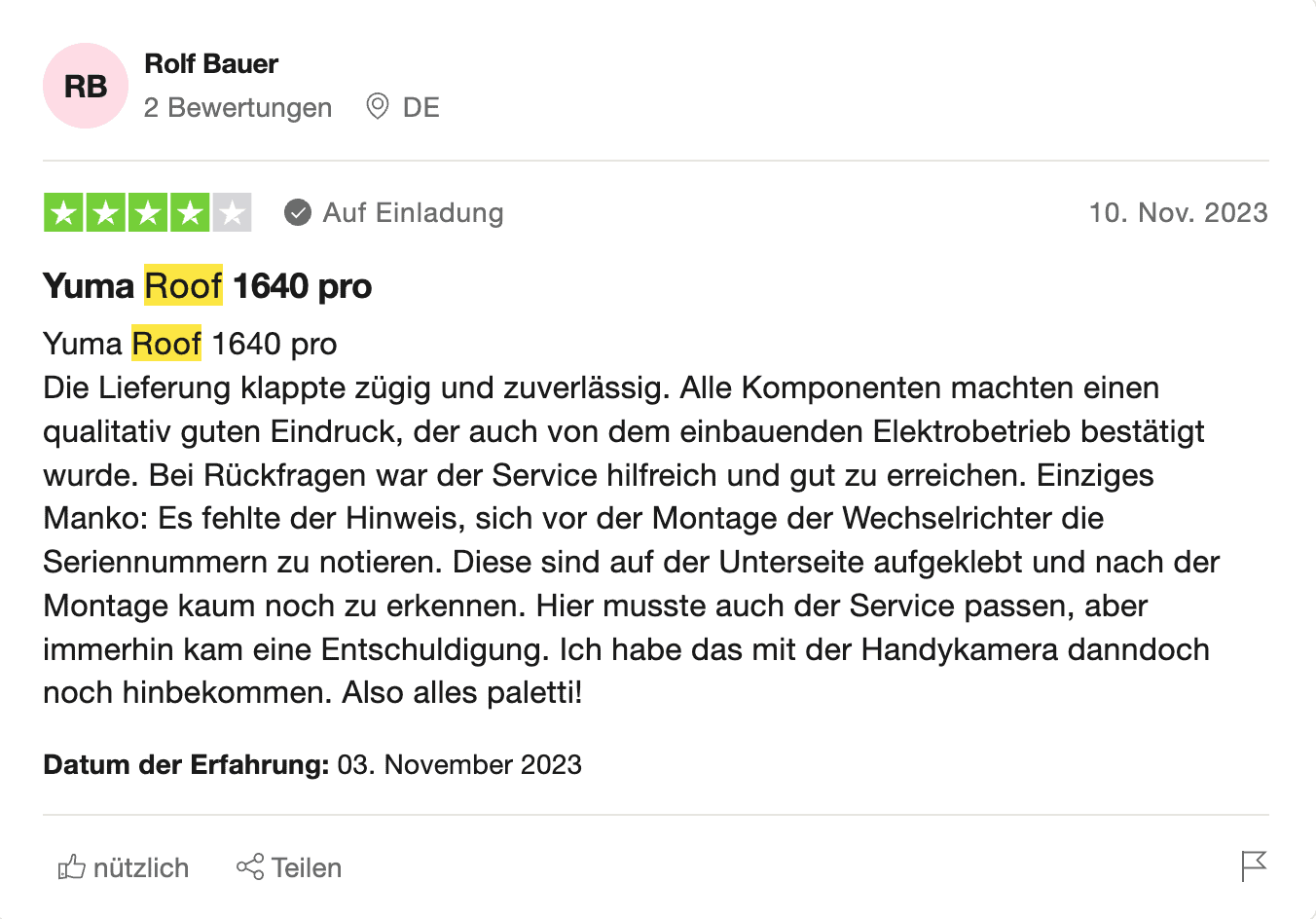 Da die Bewertungen in der Gesamtübersicht von Proven Expert bereits berücksichtigt waren, schaue ich hier spezifischer auf Bewertungen, welche sich auf das Yuma Roof beziehen.